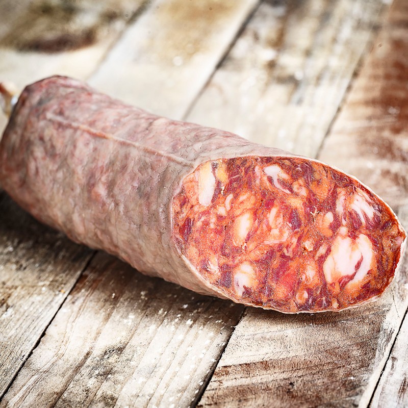 Elaboración tradicional, embuchado en tripa natural y curado en secadero natural.